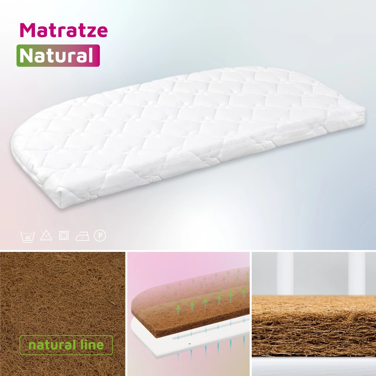 Die winzigen Hohlröhrchen der Kokosfasern sind ein hervorragender Wärmespeicher und unempfindlich gegen Feuchtigkeit. Sie bieten eine optimale Druckverteilung und eine stets gleichbleibende, stützende Elastizität. Die Matratze babybay® Natural erzeugt zusammen mit dem wunderbar weichen Baumwollbezug ein babygerechtes Mikroklima: Luft kann optimal zirkulieren, ohne dem Körper dabei zu viel Wärme zu entziehen. Der Kokosfaser-Naturlatex-Matratzenkern passt sich durch die aufwendige Versteppung des Baumwollbezuges im Sternedesign ideal der Körperform Ihres Lieblings an, wirkt stützend und sorgt so für einen tiefen, langen, erholsamen und traumhaften Babyschlaf.